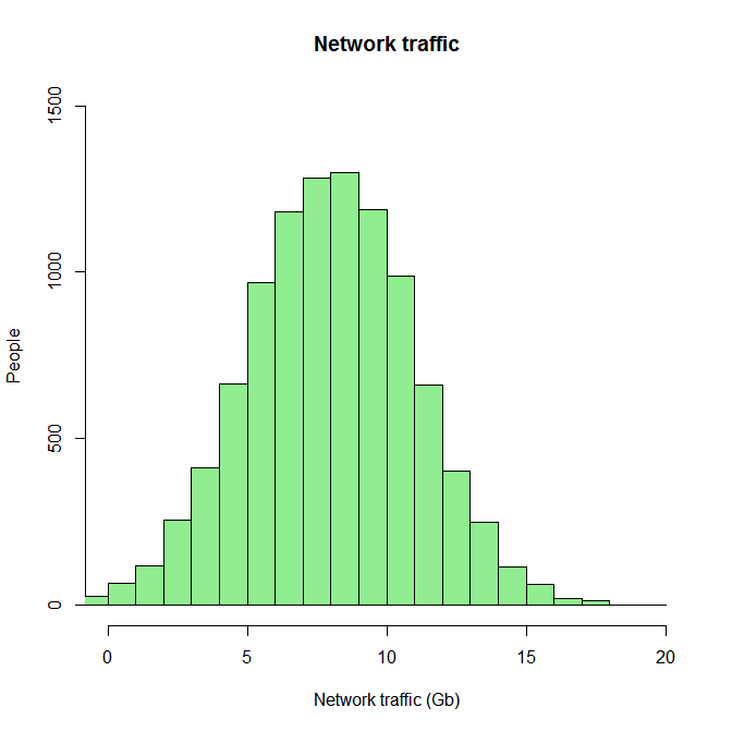 1 | a <- hist(flow, breaks = 30, xlab = "Network traffic (Gb)", ylab = "People", main = "Network traffic", col = "lightgreen", xlim = c(0, 20), ylim = c(0, 1500)) |